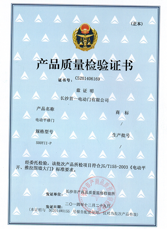 平移門質量檢驗證書